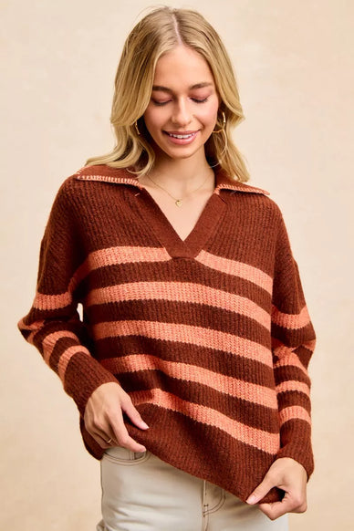 The striped sweater top with collar stitched details is a chic and sophisticated addition to your wardrobe. The striped pattern adds a timeless touch, while the collar stitched details elevate the design with a polished look. This sweater top is perfect for both casual and semi-formal occasions. Stay cozy and stylish with the comfortable fabric and classic stripes. Make a fashion statement with this striped sweater top that exudes elegance and charm.