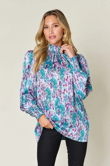 Double Take Full Size Printed Smocked Long Sleeve Blouse