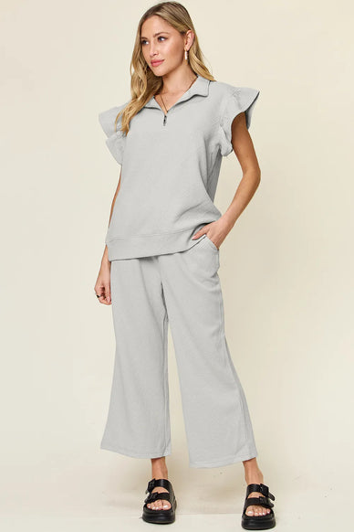 Double Take Texture Ruffle Short Sleeve Top and Drawstring Wide Leg Pants Set