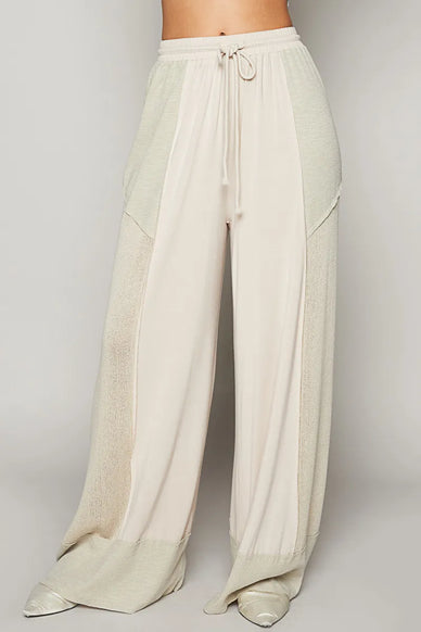 These relaxed wide leg lounge pants feature a comfortable elastic waistband with adjustable drawstring closure for a perfect fit. Crafted from lightweight, breathable fabric in a versatile neutral beige tone, they offer ultimate comfort for lounging or casual outings. The flowing wide leg silhouette creates an elegant drape while providing maximum freedom of movement. The high-waisted design offers a flattering fit, while the minimalist styling makes them easy to pair with various tops. Perfect for those seeking comfort without compromising on style, these pants are ideal for relaxation, yoga, or casual everyday wear.