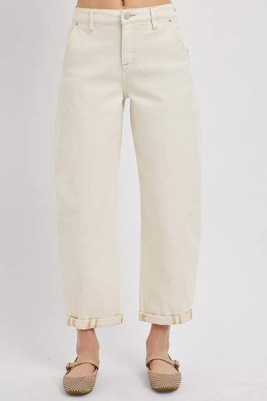 These stylish wide leg cropped jeans feature cream beige tone. Crafted from premium cotton blend denim fabric for all-day comfort and durability. The relaxed wide leg silhouette offers a flattering fit while the cropped length creates a modern, chic look. Perfect for casual outings, weekend wear, or dressed up with heels for a fashion street style. The classic five-pocket design and rolled hem details add authentic denim appeal. Easy care machine washable fabric maintains shape and color wash after wash.