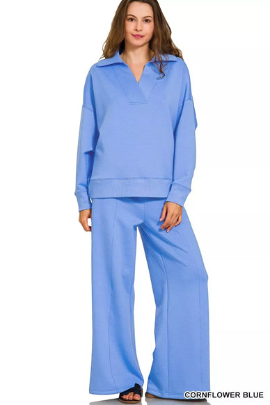 Step up your loungewear game with this sleek scuba collared pullover and pants set. The scuba material offers a modern and stylish look, while the collared design adds a touch of refinement. Perfect for relaxing at home or running errands in comfort and style. Elevate your casual wear with this coordinating set. A must-have addition to your leisure wardrobe.